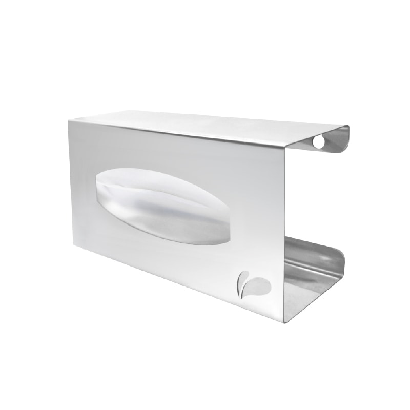 Suporte em aço inox para caixa de máscaras descartáveis, com película protetora. Pode ser utilizado na parede ou sobre a mesa. Ótimo para manter a bancada organizada.